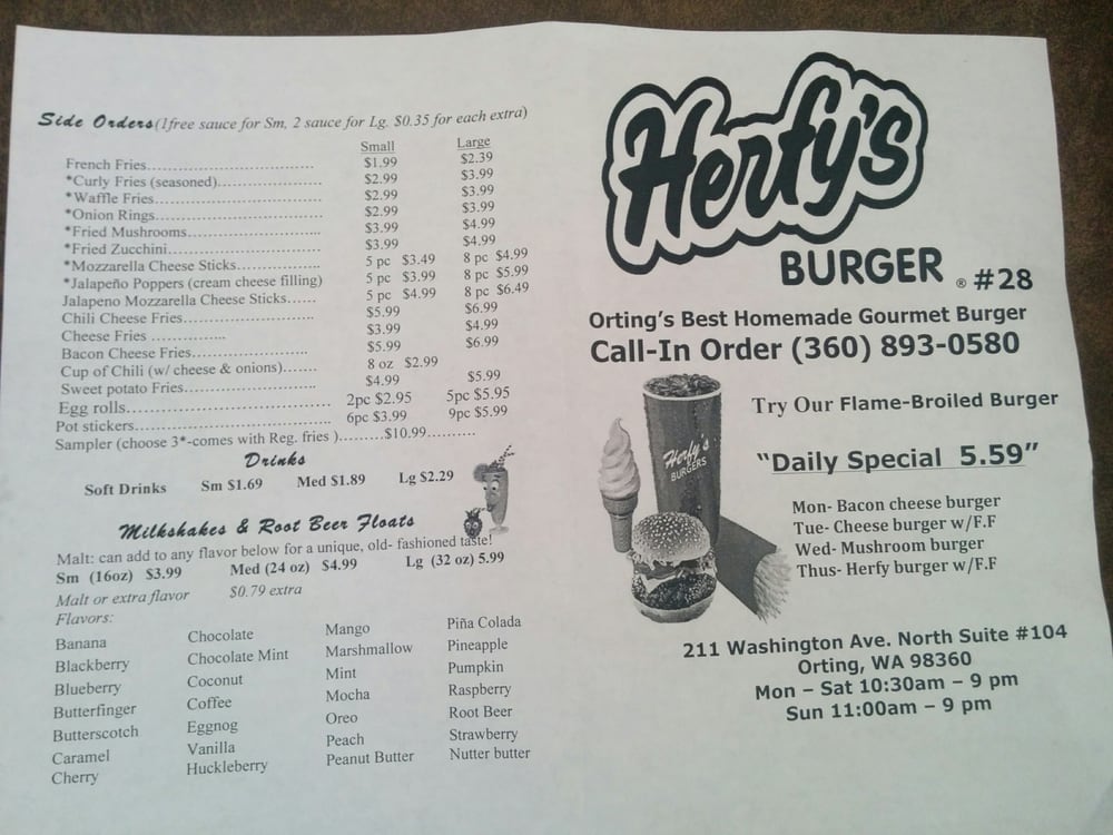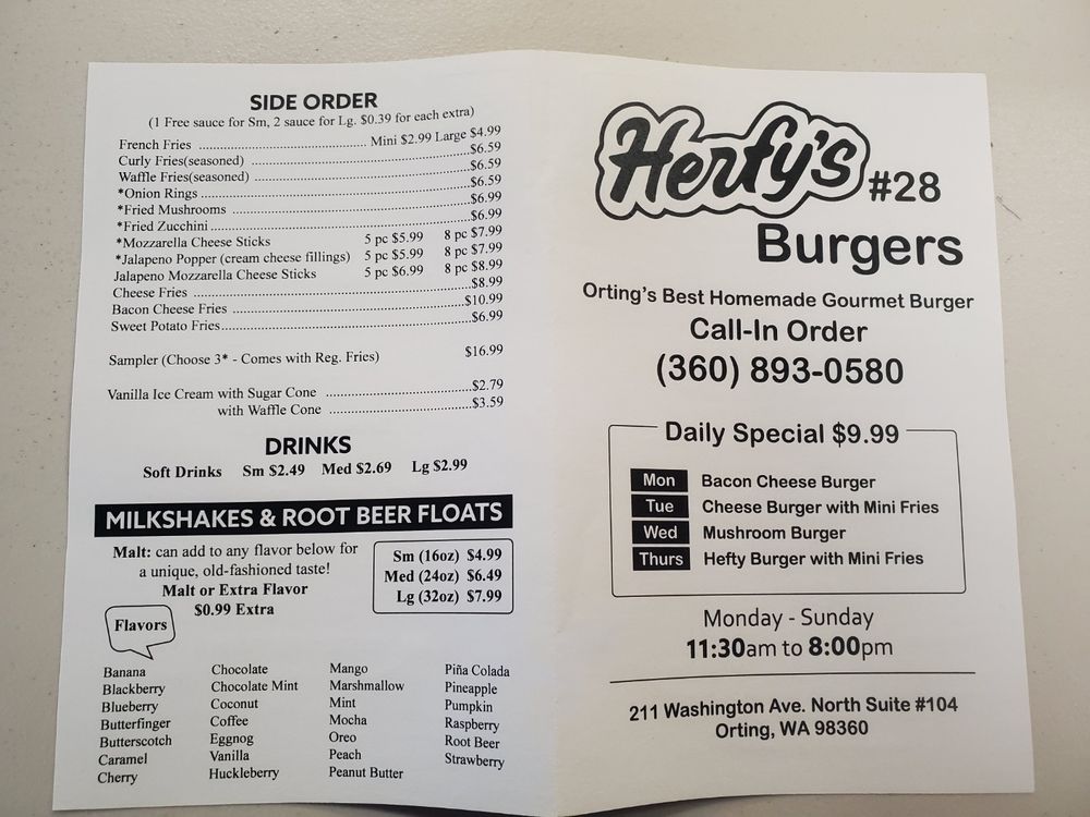 Welcome to Herfy’s Burgers, a hotspot in Orting, WA, known for its mouth-watering burgers and hot dogs. This Asian-owned restaurant offers a range of options for both meat lovers and vegetarians. With amenities like Wi-Fi, TV, and outdoor seating, Herfy’s Burgers is a great spot for families, friends, or solo diners. The menu features a variety of options, from classic cheeseburgers to specialty hot dogs, all made with high-quality ingredients. Whether you're looking for a quick bite on the go or a sit-down meal with friends, Herfy’s Burgers has you covered. Don't miss out on their happy hour specials and delicious cocktails. Overall, Herfy’s Burgers provides a casual dining experience with excellent food and service.